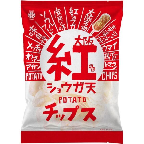 大阪のB級ソウルフード・紅ショウガ天を風味豊かなポテトチップスにしました。程よい酸味と、しっかりした塩味が後を引くこと間違いなしです。