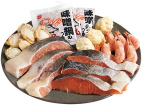 商品内容:内容量:鮭切身60g×6・ボイル甘えび×6・ボイル帆立×6・つまみ揚げ(カニ風味)×3・味噌鍋のタレ50g×2、賞味期間:出荷日より冷凍90日