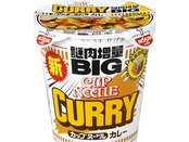 カップヌードルカレーのビッグサイズ。カレーが絡むコシのある太麺に、野菜の甘味のあるマイルドでとろみのあるカレースープ。具材はポテト、ダイスポーク、にんじん、オニオン、ねぎ。