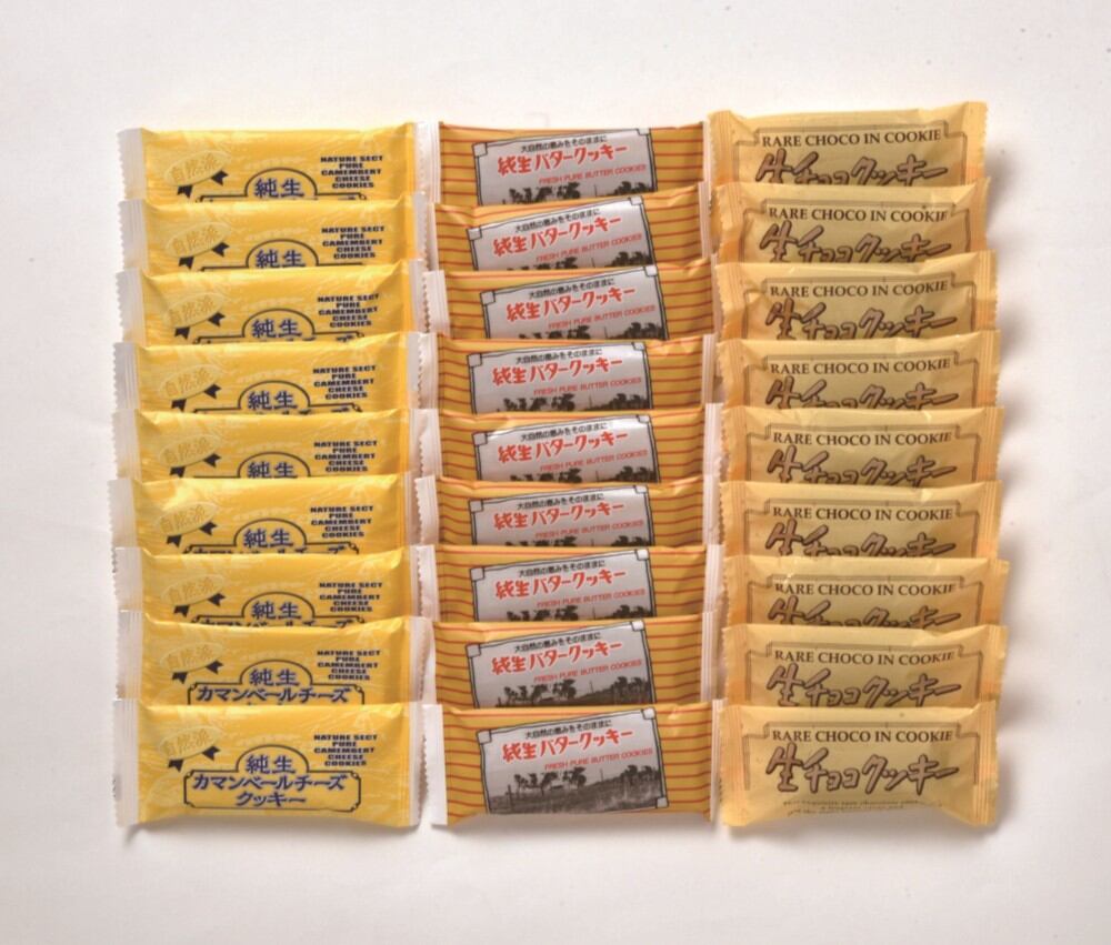 商品内容:カマンベールチーズクッキー・純生バタークッキー/各2枚×9袋、生チョコクッキー/9袋