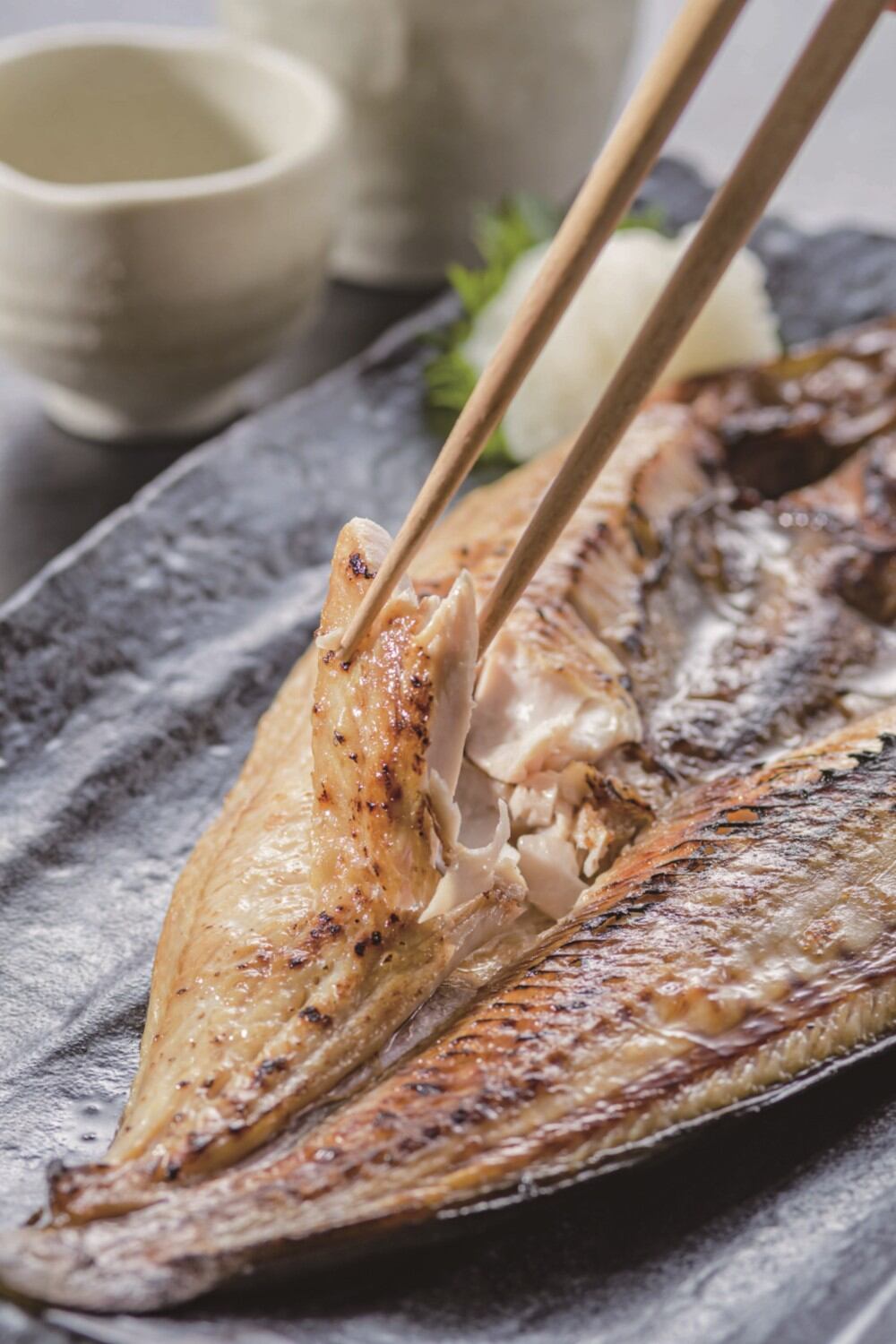 「ピチピチ造り?」は水あめと半透膜を利用した浸透圧脱水製法の一夜干しです。この製法は、魚から余分な水分と生臭みを取り除きふっくらやわらかく焼きあがります。