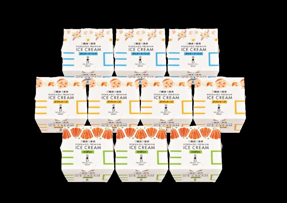 商品内容:三國推奨北海道プレミアムアイス(カスタードバニラ・かぼちゃ)/各100ml×3、三國推奨北海道プレミアムアイス(ダブルチーズ)/100ml×4